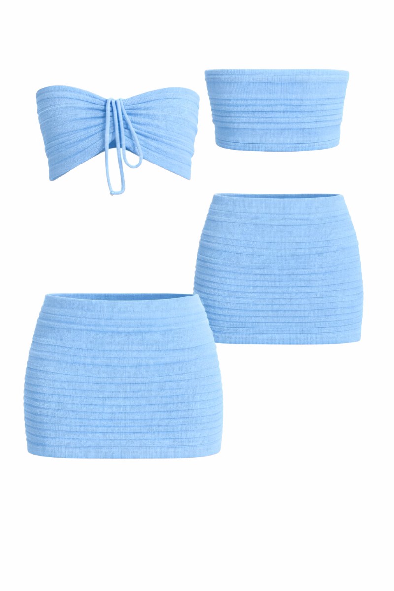 A comfy knit set featuring a tube cropped bandeau top and high-waisted skirt, made with a soft