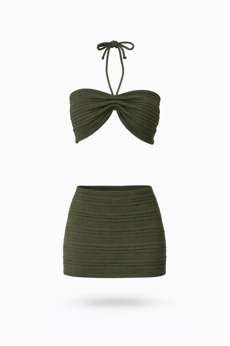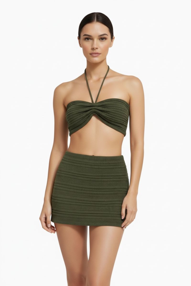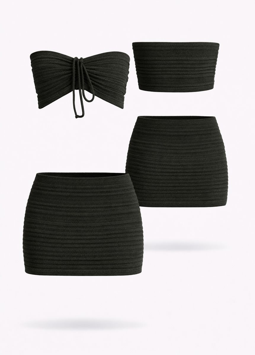 A comfy knit set featuring a tube cropped bandeau top and high-waisted skirt, made with a soft