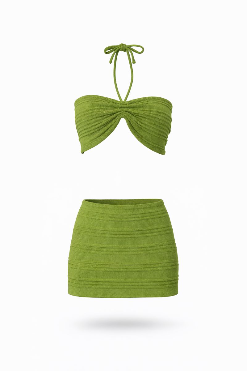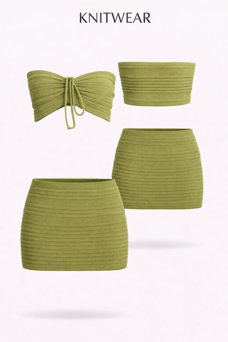A comfy knit set featuring a tube cropped bandeau top and high-waisted skirt, made with a soft