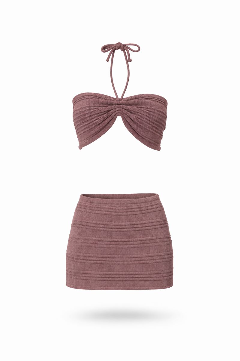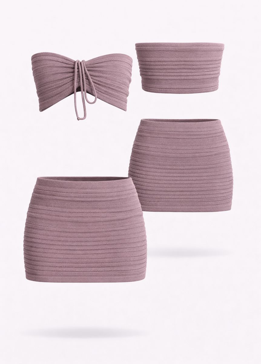 A comfy knit set featuring a tube cropped bandeau top and high-waisted skirt, made with a soft