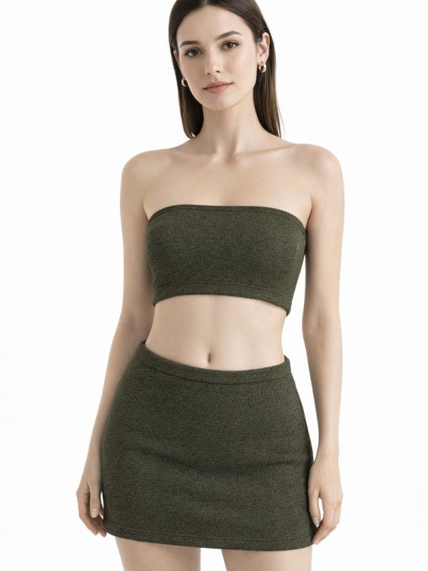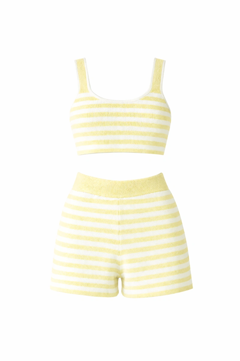 A comfy knit set featuring a cropped tank top and high-waisted shorts, made with a soft stretch