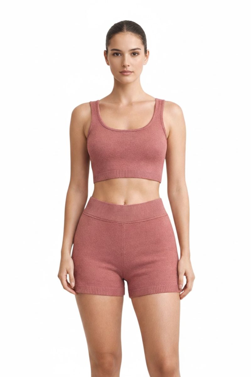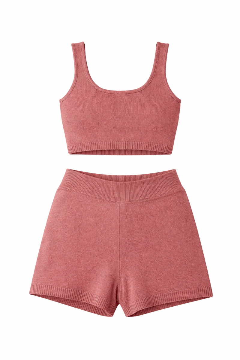 A comfy knit set featuring a cropped tank top and high-waisted shorts, made with a soft stretch