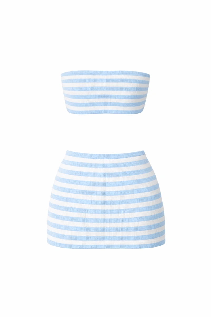 A comfy knit set featuring a cropped bandeau top and high-waisted skirt, made with a soft
