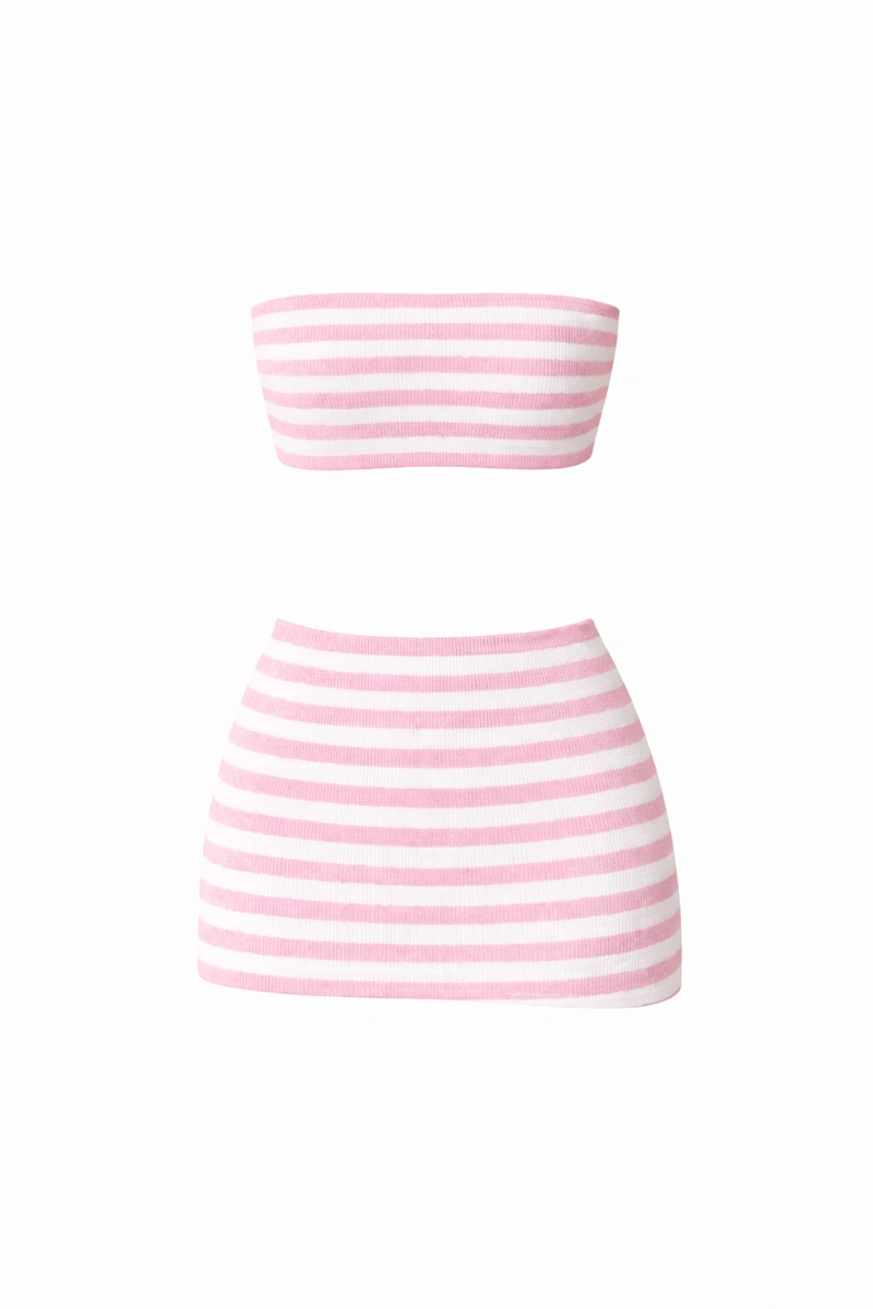 A comfy knit set featuring a cropped bandeau top and high-waisted skirt, made with a soft