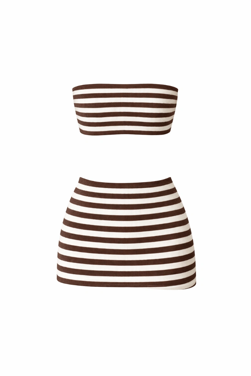 A comfy knit set featuring a cropped bandeau top and high-waisted skirt, made with a soft
