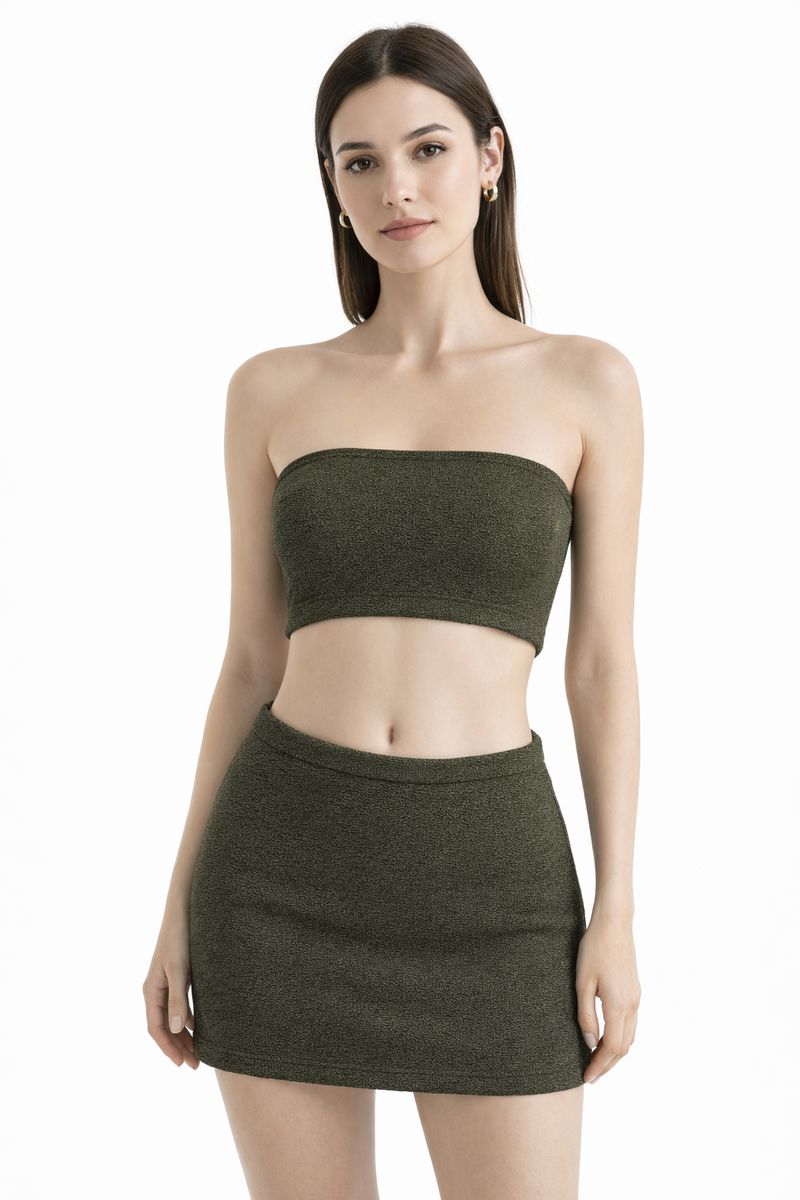 A comfy knit set featuring a cropped bandeau top and high-waisted skirt, made with a soft