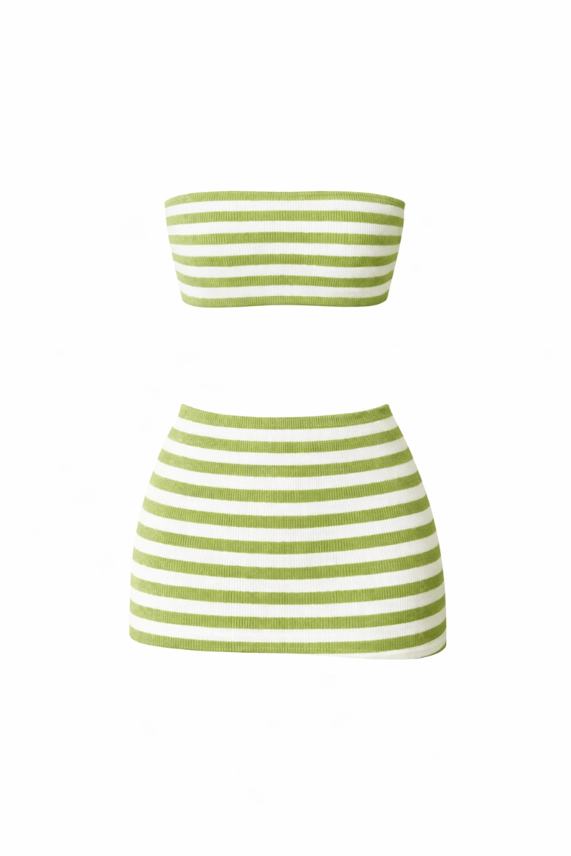 A comfy knit set featuring a cropped bandeau top and high-waisted skirt, made with a soft