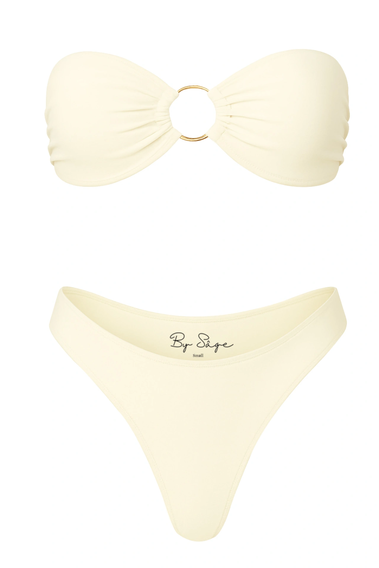 Top: Bandeau bikini with adjustable ties at the back for a customizable fit.